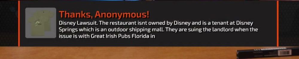 Disney Lawsuit. The restaurant isnt owned by Disney and is a tenant at Disney Springs which is an outdoor shipping mall. They are suing the landlord when the issue is with Great Irish Pubs Florida in