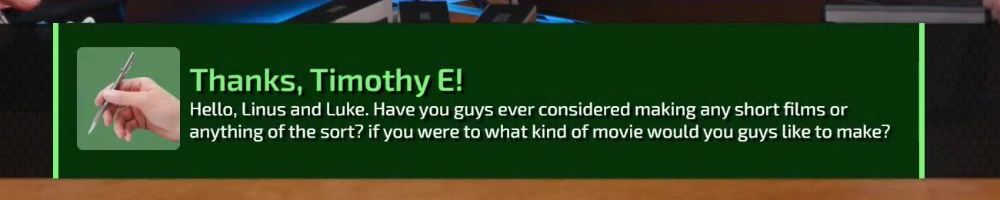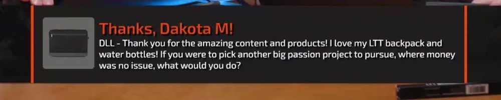 DLL - Thank you for the amazing content and products! I love my LTT backpack and water bottles! If you were to pick another big passion project to pursue, where money was no issue, what would you do?