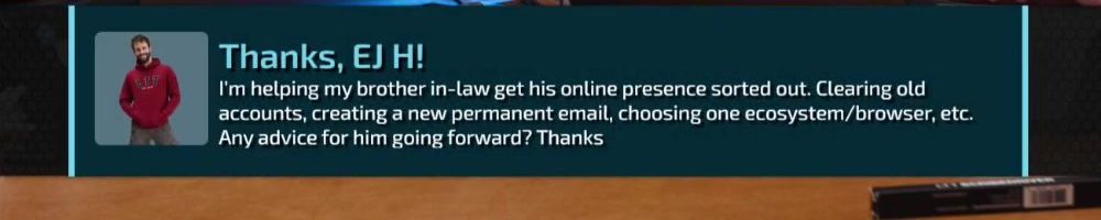 I'm helping my brother in-law get his online presence sorted out. Clearing old accounts, creating a new permanent email, choosing one ecosystem/browser, etc. Any advice for him going forward? Thanks