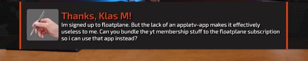Im signed up to floatplane. But the lack of an appletv-app makes it effectively useless to me. Can you bundle the yt membership stuff to the floatplane subscription so i can use that app instead?