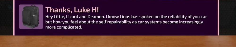 Hey Little, Lizard and Deamon. I know Linus has spoken on the reliability of you car but how you feel about the self repairability as car systems become increasingly more complicated.