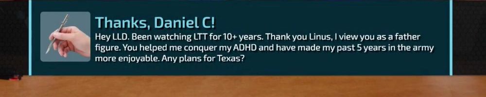 Hey LLD. Been watching LTT for 10+ years. Thank you Linus, I view you as a father figure. You helped me conquer my ADHD and have made my past 5 years in the army more enjoyable. Any plans for Texas?