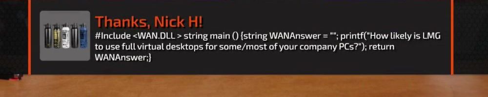 #include <WAN.DLL> string main () {string WANAnswer = ""; printf("How likely is LMG to use full virtual desktops for some/most of your company PCs?"); return WANAnswer;}