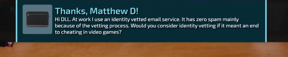 Hi DLL. At work I use an identity vetted email service. It has zero spam mainly because of the vetting process. Would you consider identity vetting if it meant an end to cheating in video games?