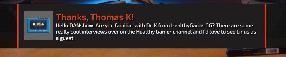 Hello DANshow! Are you familiar with Dr. K from HealthyGamerGG? There are some really cool interviews over on the Healthy Gamer channel and I'd love to see Linus as a guest.