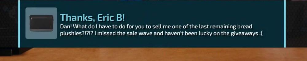 Dan! What do I have to do for you to sell me one of the last remaining bread plushies?!?! I missed the sale wave and haven't been lucky on the giveaways :(