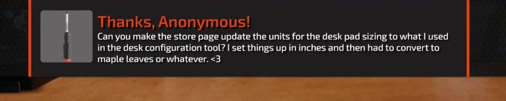 Can you make the store page update the units for the desk pad sizing to what I used in the desk configuration tool? I set things up in inches and then had to convert to maple leaves or whatever. <3