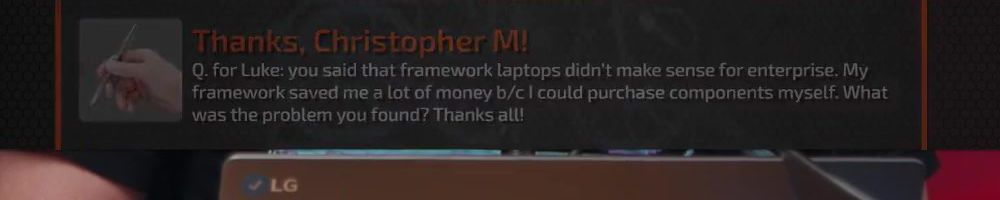 Q. for Luke: you said that framework laptops didn't make sense for enterprise. My framework saved me a lot of money b/c I could purchase components myself. What was the problem you found? Thanks all!