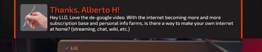 Hey LLD, Love the de-google video. With the internet becoming more and more subscription base and personal info farms, is there a way to make your own internet at home? (streaming, chat, wiki, etc.)