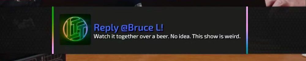 Reply @Bruce L! Watch it together over a beer. No idea. This show is weird.