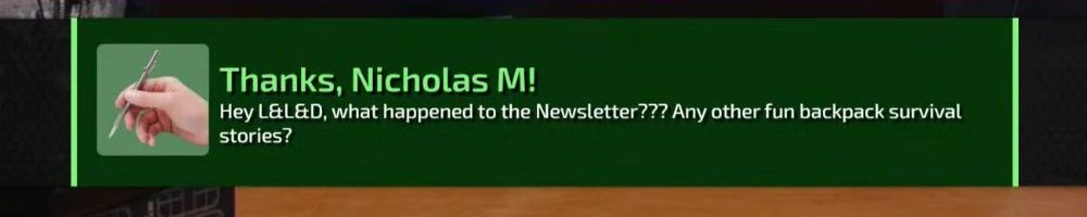 Thanks, Nicholas M! Hey L&L&D, what happened to the Newsletter??? Any other fun backpack survival stories?