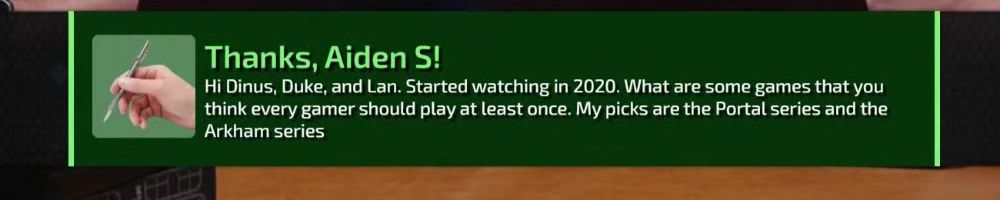 Thanks, Aiden S! Hi Dinus, Duke, and Lan. Started watching in 2020. What are some games that you think every gamer should play at least once. My picks are the Portal series and the Arkham series