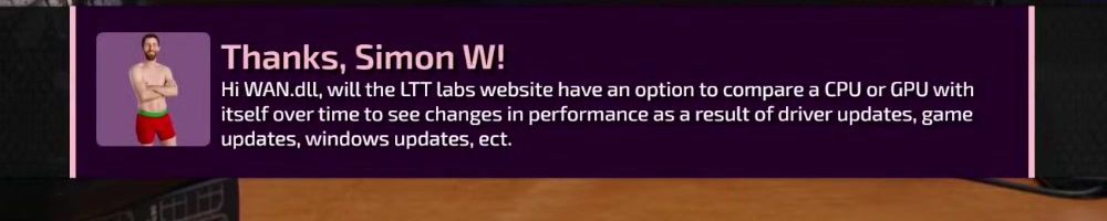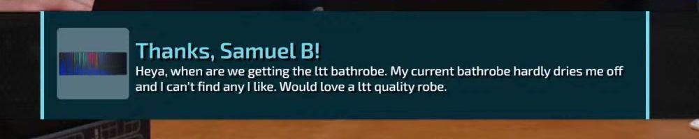 Thanks, Samuel B! Heya, when are we getting the ltt bathrobe. My current bathrobe hardly dries me off and I can't find any I like. Would love a ltt quality robe.