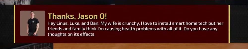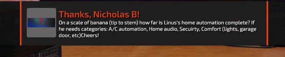 Thanks, Nicholas B! On a scale of banana (tip to stem) how far is Linus's home automation complete? If he needs categories: A/C automation, Home audio, Secuirty, Comfort (lights, garage door, etc)Cheers!