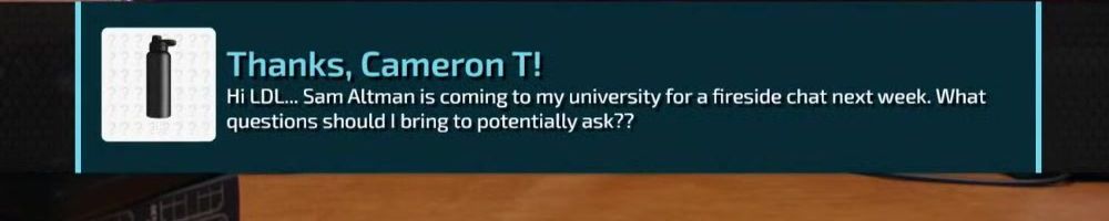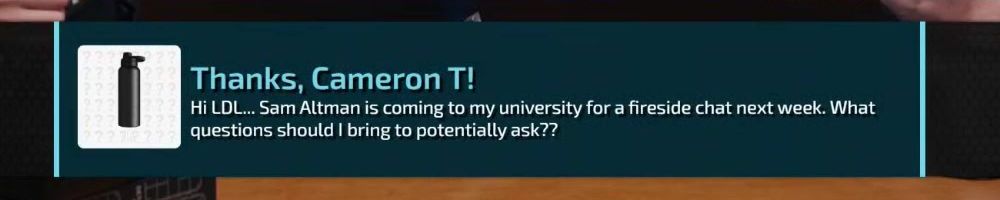 Thanks, Cameron T! Hi LDL... Sam Altman is coming to my university for a fireside chat next week. What questions should I bring to potentially ask??