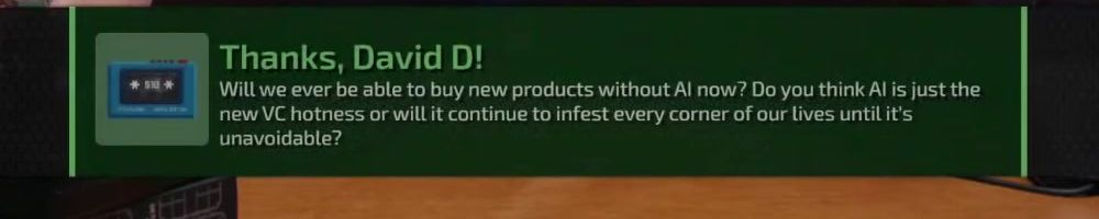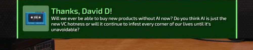 Thanks, David D! Will we ever be able to buy new products without AI now? Do you think AI is just the new VC hotness or will it continue to infest every corner of our lives until it's unavoidable?