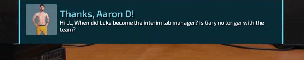 Thanks, Aaron D! Hi LL, When did Luke become the interim lab manager? Is Gary no longer with the team?