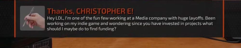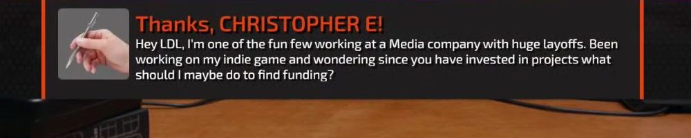 Thanks, CHRISTOPHER E! Hey LDL, I'm one of the fun few working at a Media company with huge layoffs. Been working on my indie game and wondering since you have invested in projects what should I maybe do to find funding?
