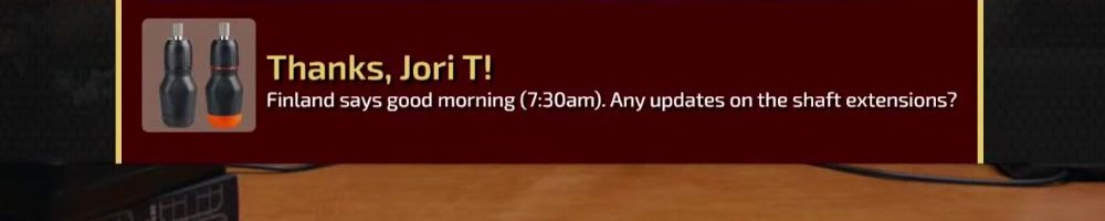 Thanks, Jori T! Finland says good morning (7:30am). Any updates on the shaft extensions?