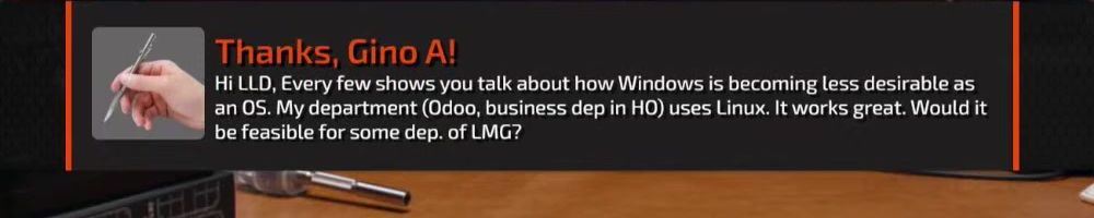 Thanks, Gino A! Hi LLD, Every few shows you talk about how Windows is becoming less desirable as an OS. My department (Odoo, business dep in HO) uses Linux. It works great. Would it be feasible for some dep. of LMG?