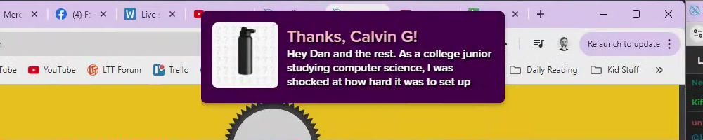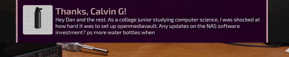 Thanks, Calvin G! Hey Dan and the rest. As a college junior studying computer science, I was shocked at how hard it was to set up openmediavault. Any updates on the NAS software investment? ps more water bottles when