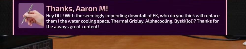 Thanks, Aaron M! Hey DLL! With the seemingly impending downfall of EK, who do you think will replace them | the water cooling space, Thermal Grizley, Alphacooling, Byski(lol)? Thanks for the always great content!
