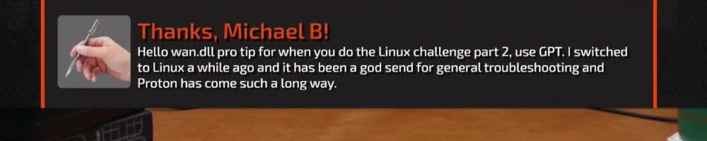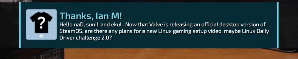 Thanks, Ian M! Hello naD, sunil and ekul. Now that Valve is releasing an official desktop version of SteamOS, are there any plans for a new Linux gaming setup video, maybe Linux Daily Driver challenge 2.0?
