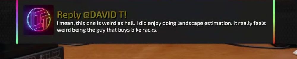 Reply @DAVID T! I mean, this one is weird as hell. I did enjoy doing landscape estimation. It really feels weird being the guy that buys bike racks.