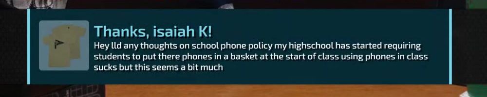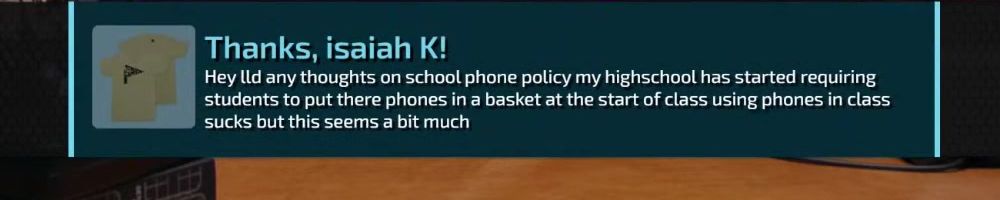 Thanks, isaiah K! Hey ld any thoughts on school phone policy my highschool has started requiring students to put there phones in a basket at the start of class using phones in class sucks but this seems a bit much