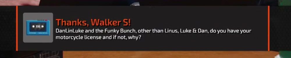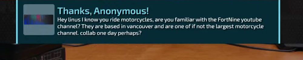 Thanks, Anonymous! Hey linus I know you ride motorcycles, are you familiar with the FortNine youtube channel? They are based in vancouver and are one of if not the largest motorcycle channel. collab one day perhaps?