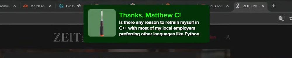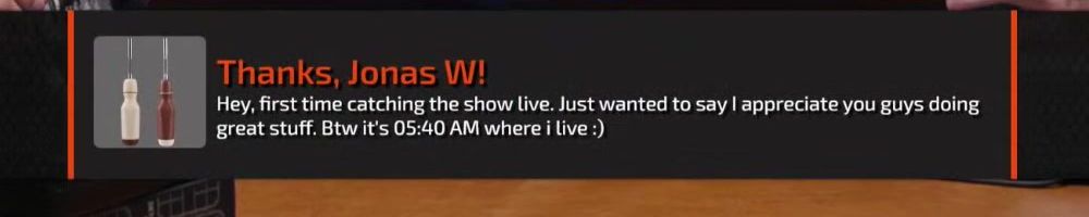 Thanks, Jonas W! Hey, first time catching the show live. Just wanted to say I appreciate you guys doing great stuff. Btw it's 05:40 AM where i live :)