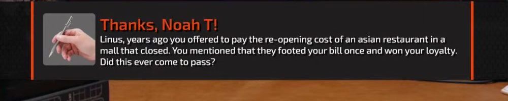 Thanks, Noah T! Linus, years ago you offered to pay the re-opening cost of an asian restaurant in a mall that closed. You mentioned that they footed your bill once and won your loyalty. Did this ever come to pass?