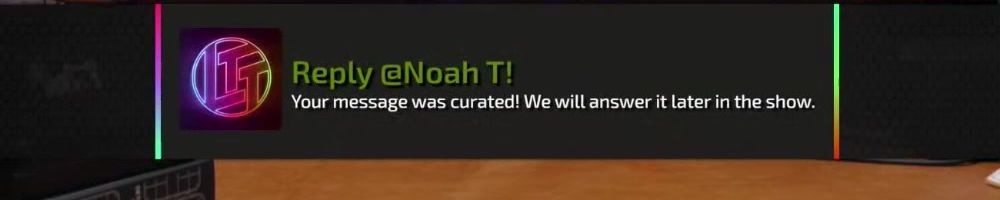 Reply @Noah T! Your message was curated! We will answer it later in the show.
