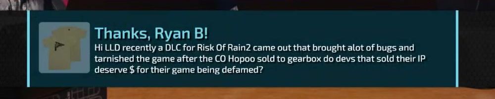 Thanks, Ryan B! Hi LLD recently a DLC for Risk Of Rain2 came out that brought alot of bugs and tamished the game after the CO Hopoo