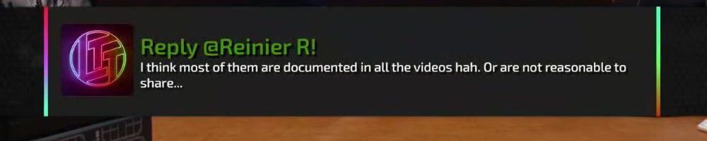 Reply @Reinier R! I think most of them are documented in all the videos hah. Or are not reasonable to share...