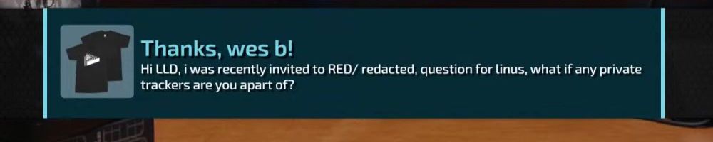 Thanks, wes b! Hi LLD, i was recently invited to RED/ redacted, question for linus, what if any private trackers are you apart of?