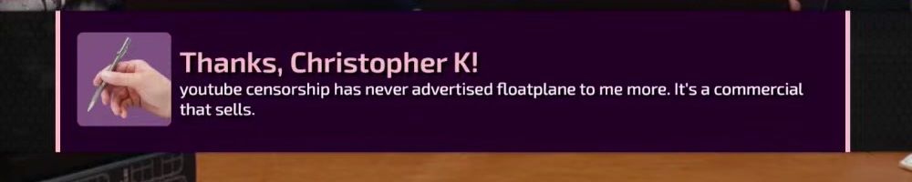 Thanks, Christopher K! youtube censorship has never advertised floatplane to me more. It's a commercial that sells.