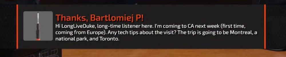 Thanks, Bartlomiej P! Hi LongLiveDuke, long-time listener here. I'm coming to CA next week (first time, coming from Europe). Any tech tips about the visit? The trip is going to be Montreal, a national park, and Toronto.