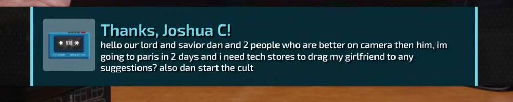 Thanks, Joshua C! hello our lord and savior dan and 2 people who are better on camera then him, im going to paris in 2 days and i need tech stores to drag my girlfriend to any suggestions? also dan start the cult