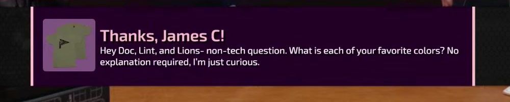 Thanks, James C! Hey Doc, Lint, and Lions- non-tech question. What is each of your favorite colors? No explanation required, I'm just curious.
