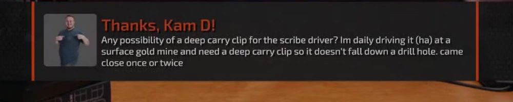 Thanks, Kam D! Any possibility of a deep carry clip for the scribe driver? Im daily driving it (ha) at a surface gold mine and need a deep carry clip so it doesn't fall down a drill hole. came close once or twice