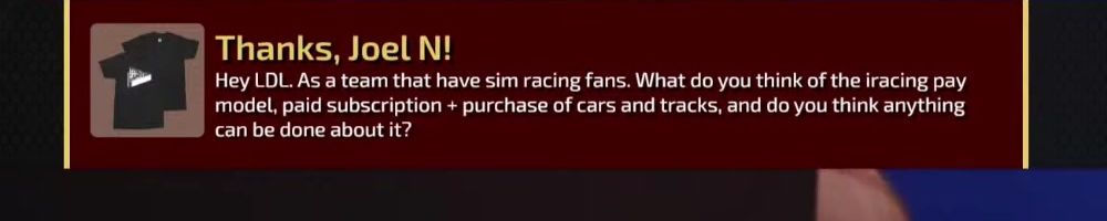 Thanks, Joel N! Hey LDL. As a team that have sim racing fans. What do you think of the iracing pay model, paid subscription + purchase of cars and tracks, and do you think anything can be done about it?