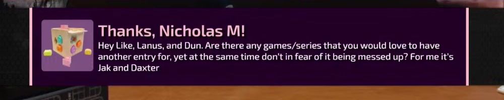 Thanks, Nicholas M! Hey Like, Lanus, and Dun. Are there any games/series that you would love to have another entry for, yet at the same time don't in fear of it being messed up? For me it's Jak and Daxter