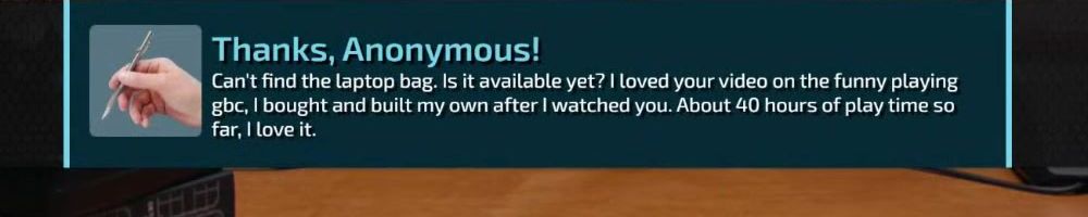 Thanks, Anonymous! Can't find the laptop bag. Is it available yet? | loved your video on the funny playing gbc, | bought and built my own after | watched you. About 40 hours of play time so far, I love it.
