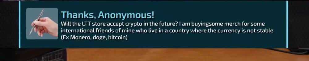 Thanks, Anonymous! Will the LTT store accept crypto in the future? I am buyingsome merch for some international friends of mine who live in a country where the currency is not stable. (Ex Monero, doge, bitcoin)