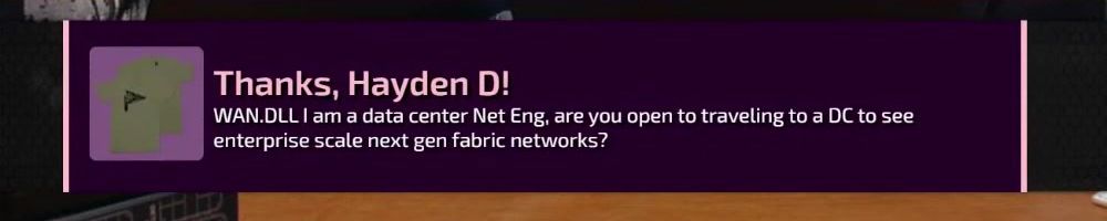 Thanks, Hayden D! WAN.DLL I am a data center Net Eng, are you open to traveling to a DC to see enterprise scale next gen fabric networks?
