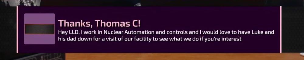 Thanks, Thomas C! Hey LLD, I work in Nuclear Automation and controls and I would love to have Luke and his dad down for a visit of our facility to see what we do if you're interested