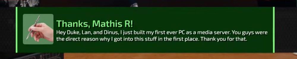 Thanks, Mathis R! Hey Duke, Lan, and Dinus, I just built my first ever PC as a media server. You guys were the direct reason why I got into this stuff in the first place. Thank you for that.