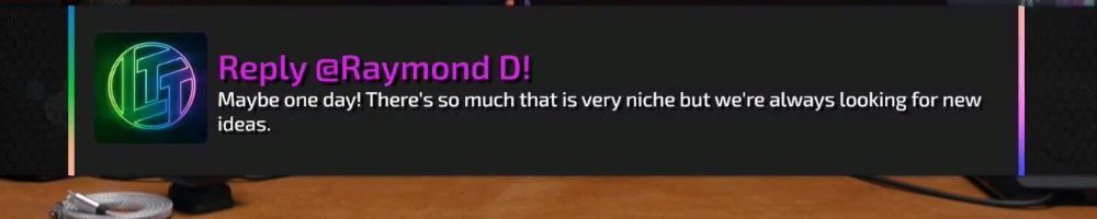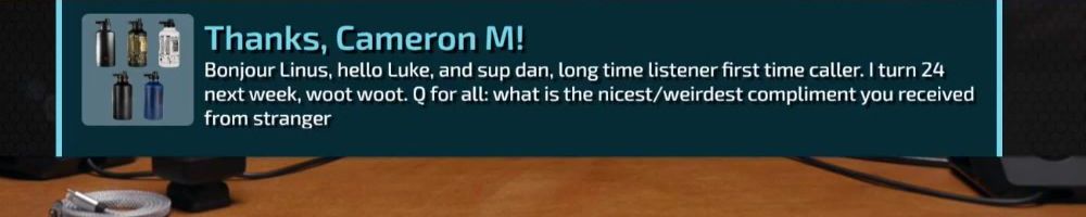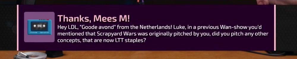 Hey LDL, "Goode avond" from the Netherlands! Luke, in a previous Wan-show you'd mentioned that Scrapyard Wars was originally pitched by you, did you pitch any other concepts, that are now LTT staples?