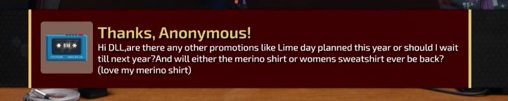 Hi DLL, are there any other promotions like Lime day planned this year or should I wait till next year? And will either the merino shirt or womens sweatshirt ever be back? (love my merino shirt)